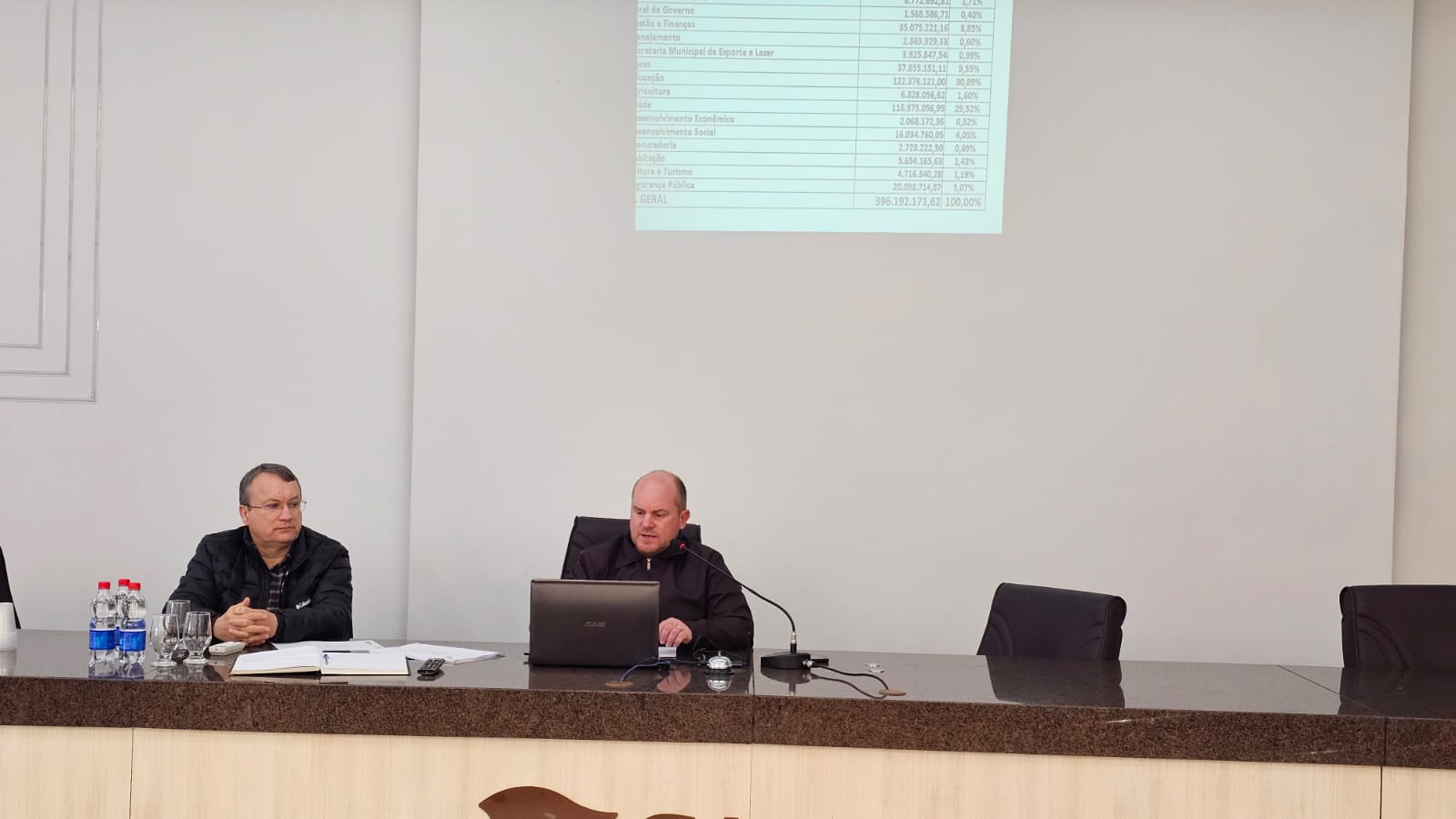 Durante a exposição, Venson apresentou os principais números da proposta, que estima receita total de R$ 396,1 milhões para o próximo ano, valor equivalente à fixação das despesas. Os maiores investimentos estão direcionados às áreas de Educação (30,89%) e Saúde (29,52%), que juntas representam mais da metade do orçamento municipal. A Secretaria de Obras e Serviços Públicos terá 9,55% do total, seguida pela Secretaria de Gestão e Finanças (8,85%) e pela Assistência Social (4,05%).
