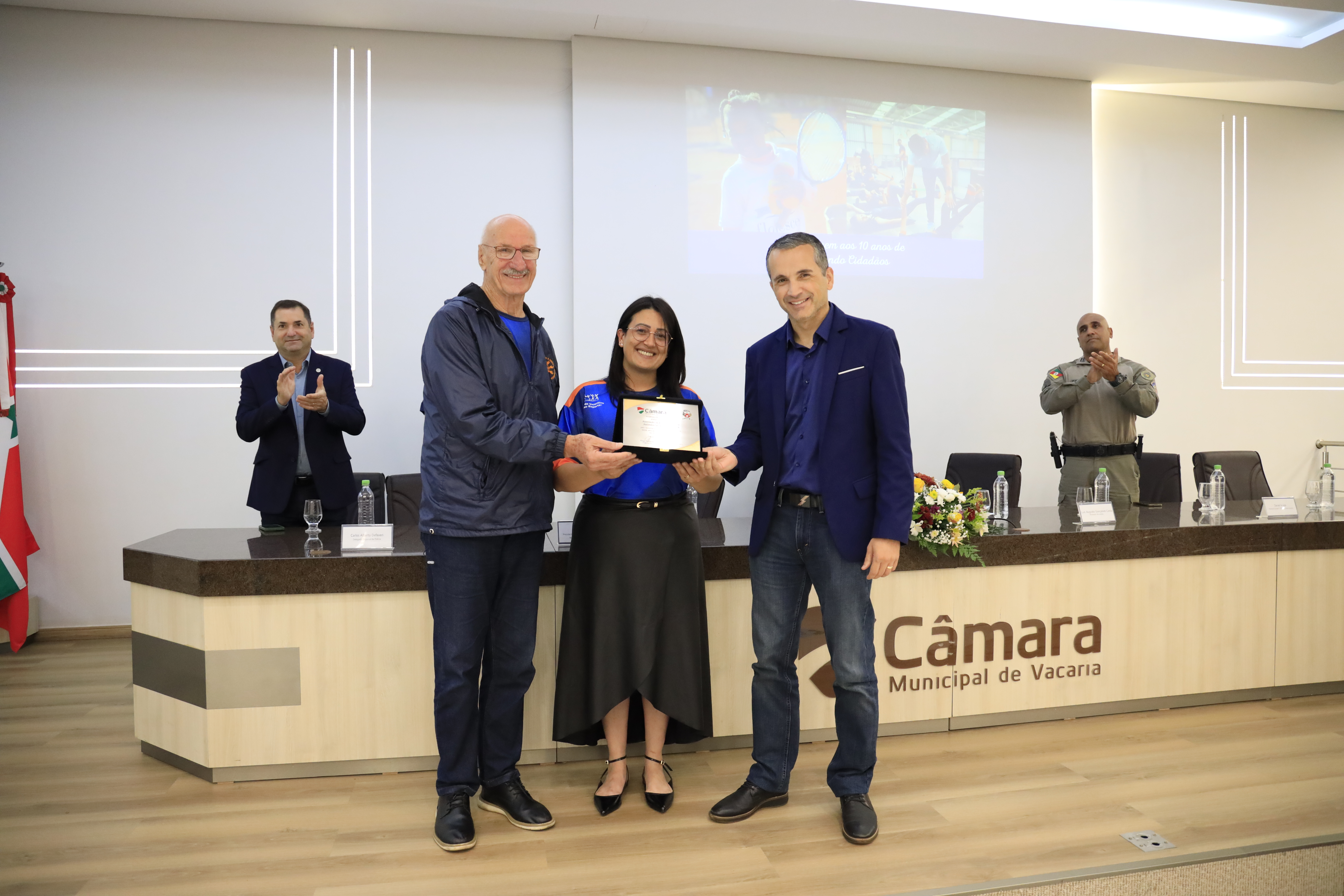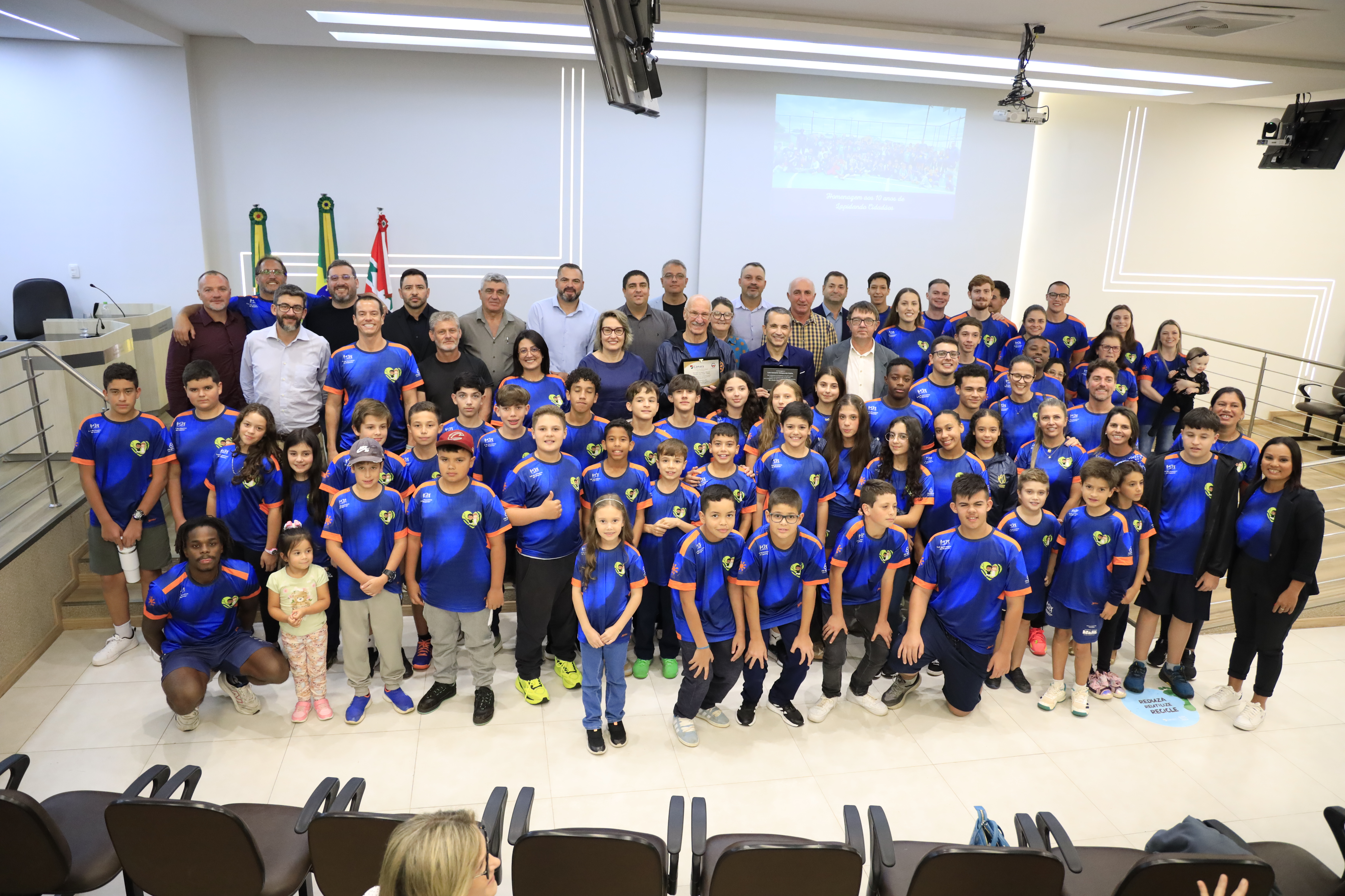A Câmara de Vereadores realizou, na noite desta quarta-feira, 22/04, uma sessão solene em homenagem aos 10 anos do projeto Lapidando Cidadãos. A iniciativa foi proposta pela vereadora Deise Montanari e reuniu autoridades, representantes da Associação de Menores Assistidos (AMMA), equipe técnica, atletas, familiares e comunidade no plenário da Casa Legislativa. A cerimônia teve como foco reconhecer a trajetória de uma iniciativa que, ao longo de uma década, utiliza o esporte, especialmente o tênis, como ferramenta de transformação social, promovendo inclusão, disciplina e novas perspectivas para crianças e adolescentes de Vacaria.