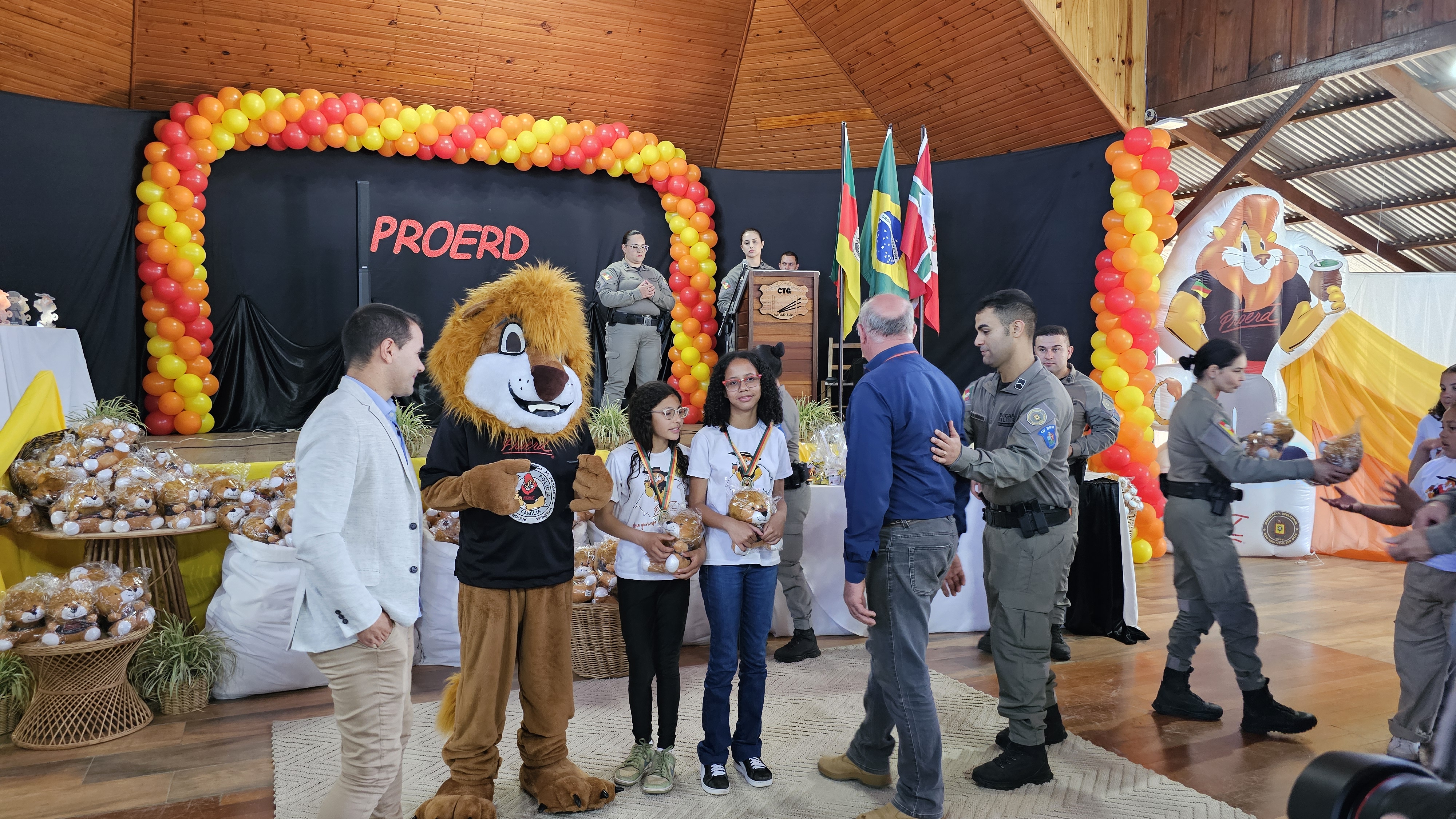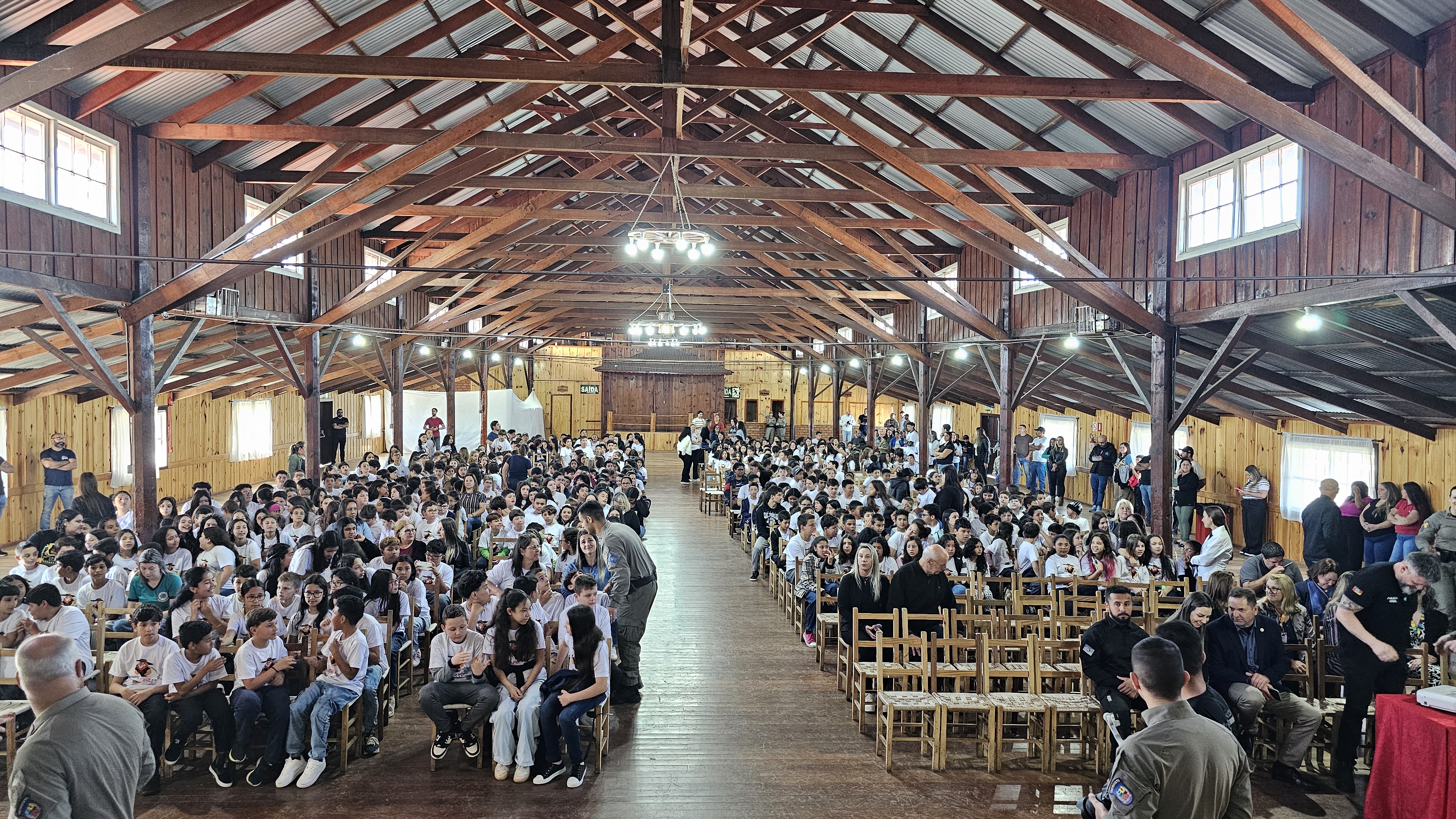 O CTG Porteira do Rio Grande recebeu, na manhã desta terça-feira,25/11, a solenidade de formatura do Programa Educacional de Resistência às Drogas e à Violência (PROERD), reunindo cerca de 650 alunos do 5º ano das escolas de Vacaria. Pais, educadores, autoridades e integrantes da Brigada Militar acompanharam a cerimônia, que marcou o encerramento das atividades do programa em 2025.