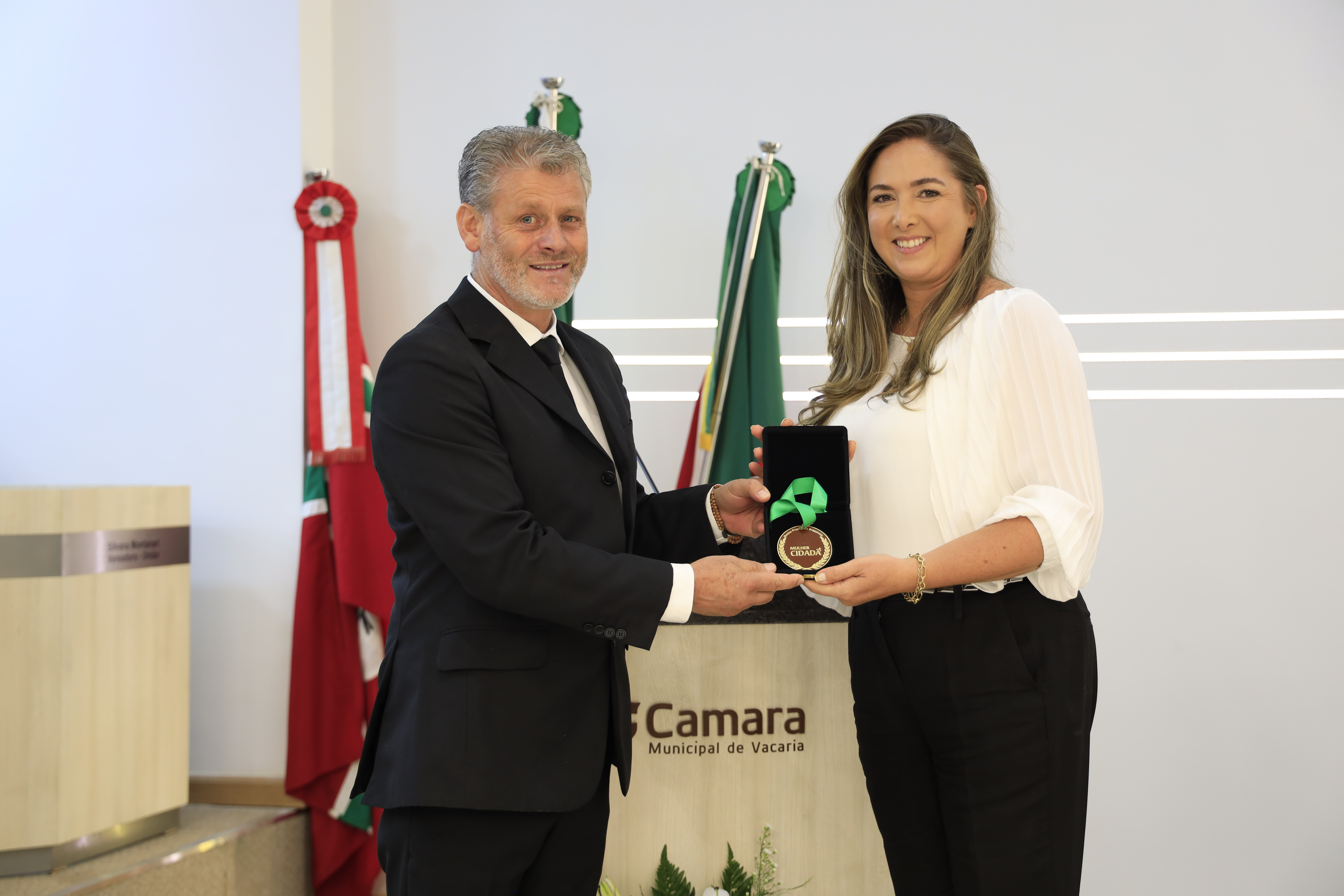 Na noite de terça-feira (11), a Câmara Municipal de Vacaria realizou a primeira sessão solene de 2025 para conceder a Medalha Mulher Cidadã à juíza de Direito da Comarca de Vacaria, Greice Prataviera Grazziotin. A homenagem, alusiva ao Dia Internacional da Mulher, foi proposta pelo vereador Fernando Cechinato Maciel (PL) e reconhece a contribuição da magistrada para a comunidade vacariense.