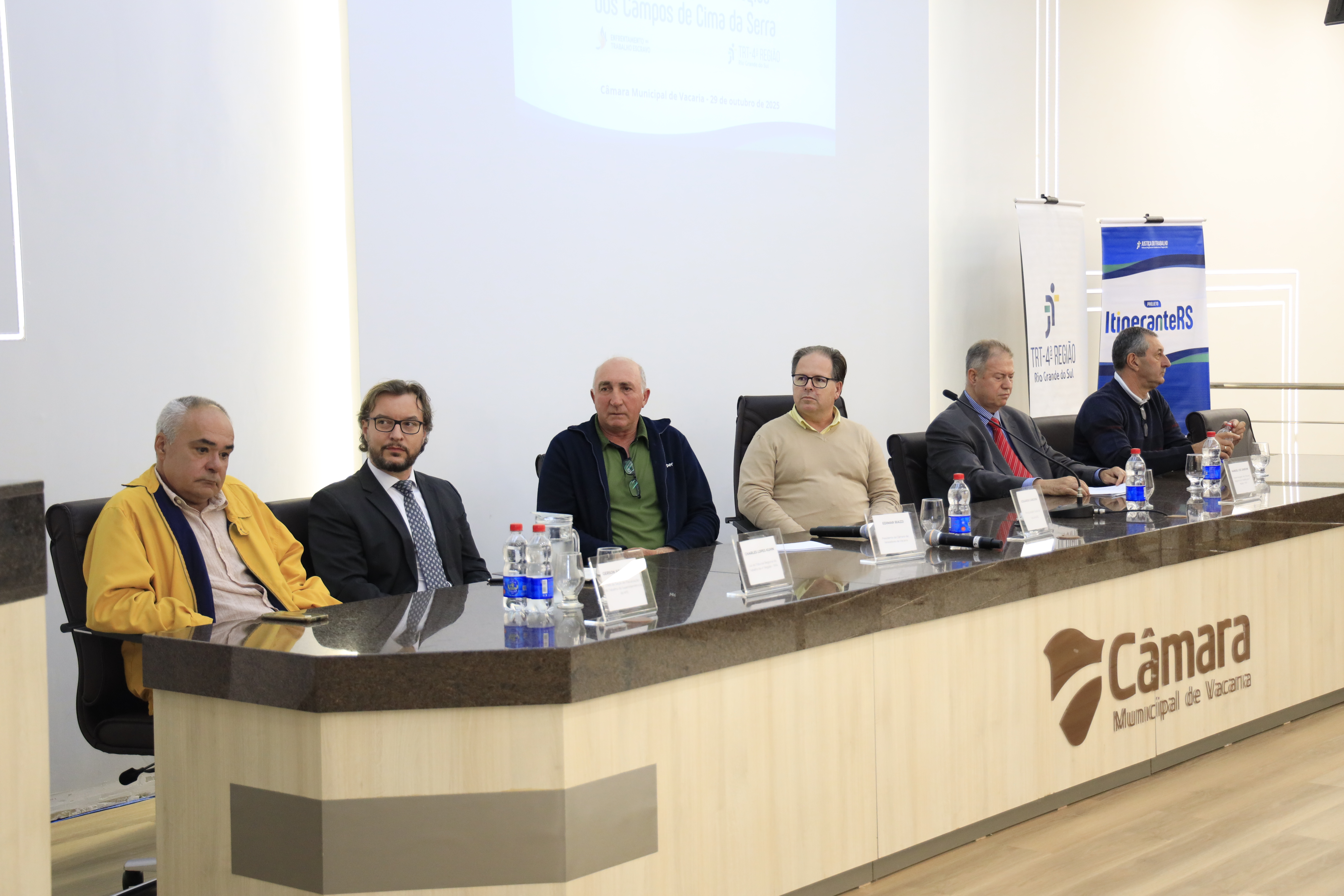 A Câmara de Vereadores sediou, na tarde desta quarta-feira,29/10, o projeto ItineranteRS – Trabalho Decente na Região dos Campos de Cima da Serra, promovido pelo Tribunal Regional do Trabalho da 4ª Região (TRT-4) em parceria com o Ministério Público do Trabalho (MPT-RS), o Ministério do Trabalho e Emprego (MTE), a Universidade de Caxias do Sul (UCS) e a própria Câmara. O encontro reuniu autoridades, trabalhadores, entidades e representantes de diversos setores para debater desafios e ações concretas pela garantia de condições dignas de trabalho no campo e na cidade.