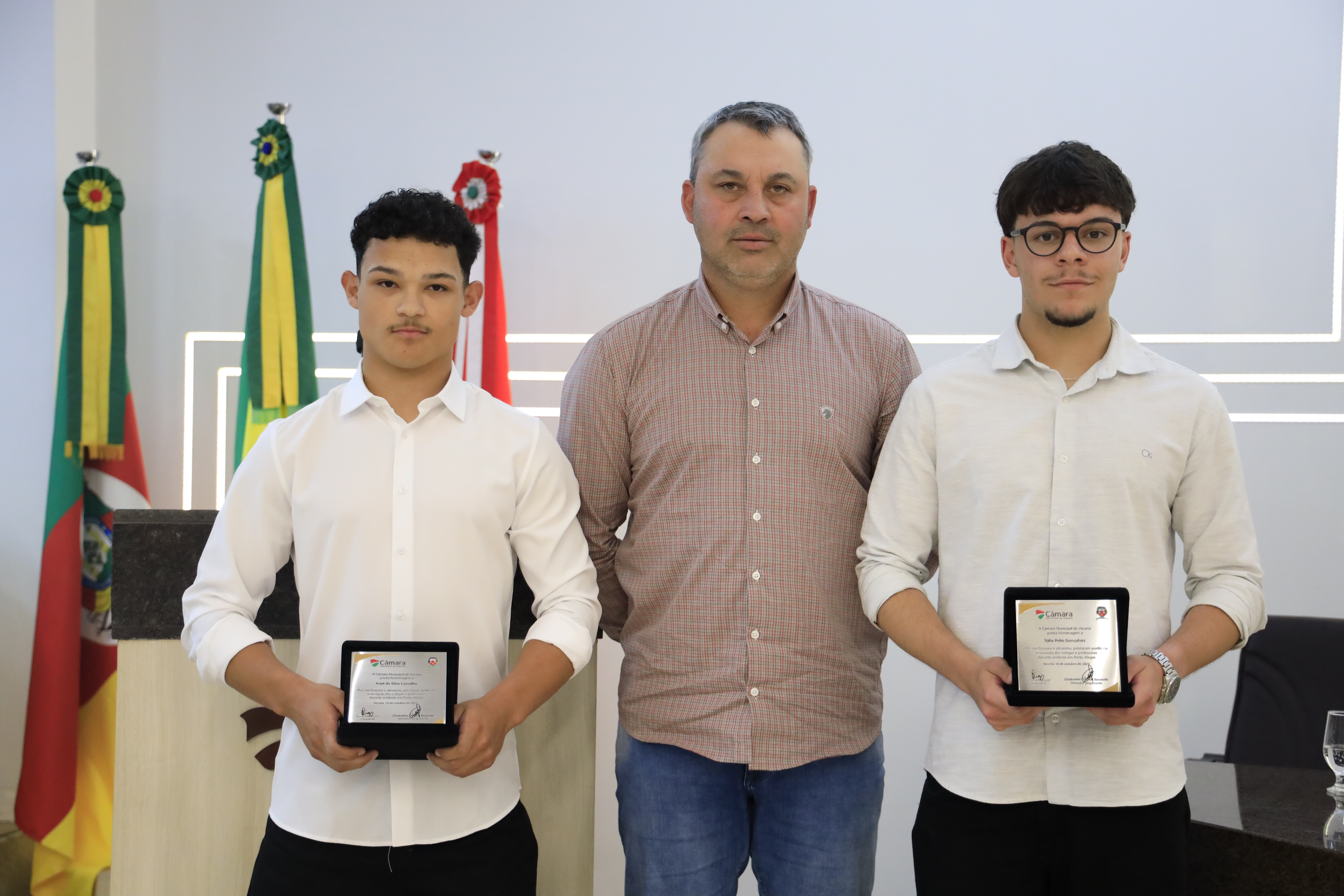 O Grande Expediente da sessão legislativa desta terça-feira,14/10, foi marcado por um momento de reconhecimento. Em atendimento ao Requerimento nº 24/2025, de autoria do vereador Pingo Rezende (PP), a Câmara de Vereadores prestou homenagem aos alunos Ariel da Silva Carvalho e Túlio Pelin Gonçalves, do Instituto Estadual de Educação Irmão Getúlio, pelos atos de coragem, solidariedade e presença de espírito demonstrados durante o grave sinistro ocorrido em Porto Alegre, quando o ônibus que transportava estudantes do ensino médio perdeu os freios, colidiu com diversos veículos e acabou incendiando-se.