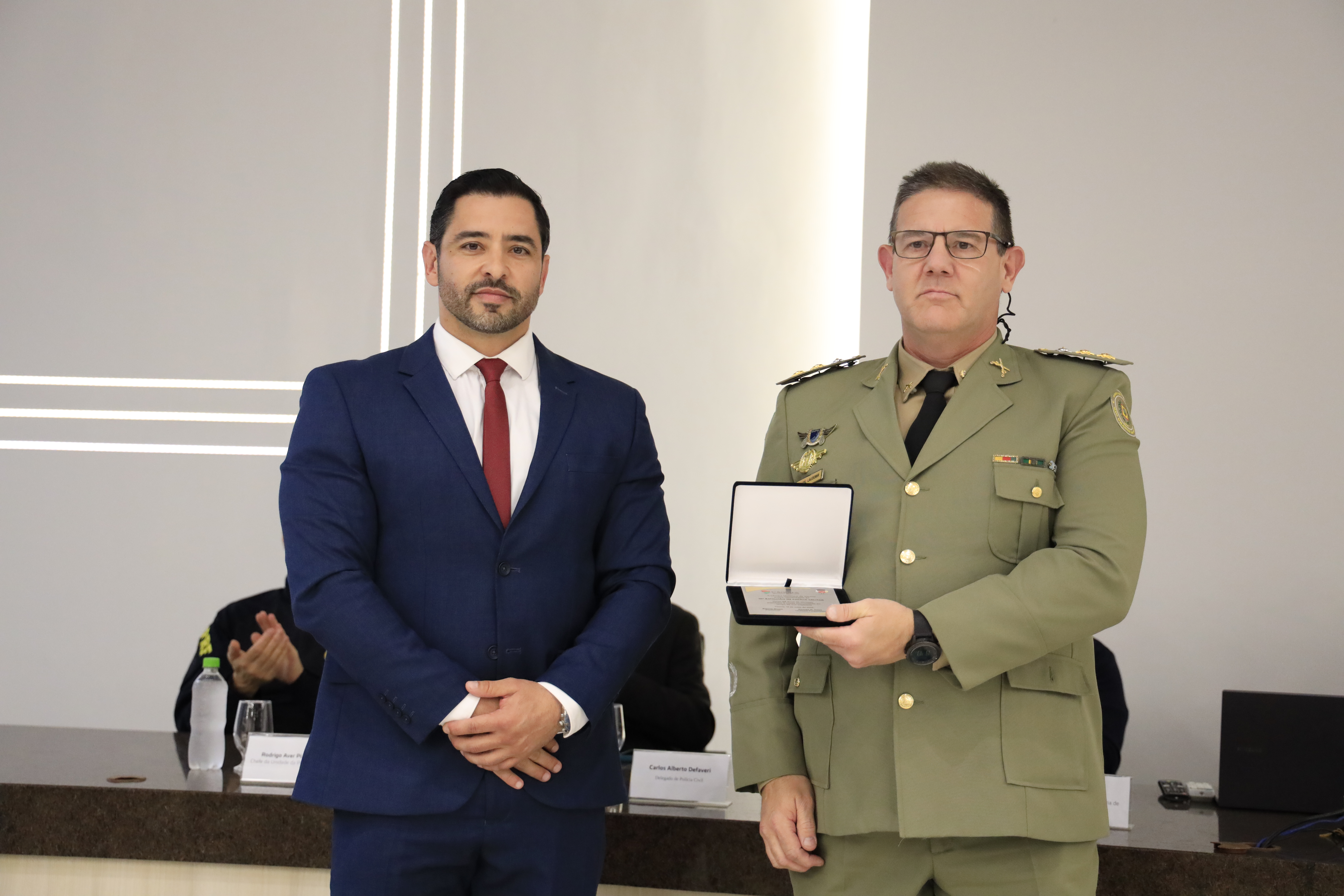Tenente-coronel Laudemir recebe placa do vereador George Pires | Crédito: Saulo Vargas
