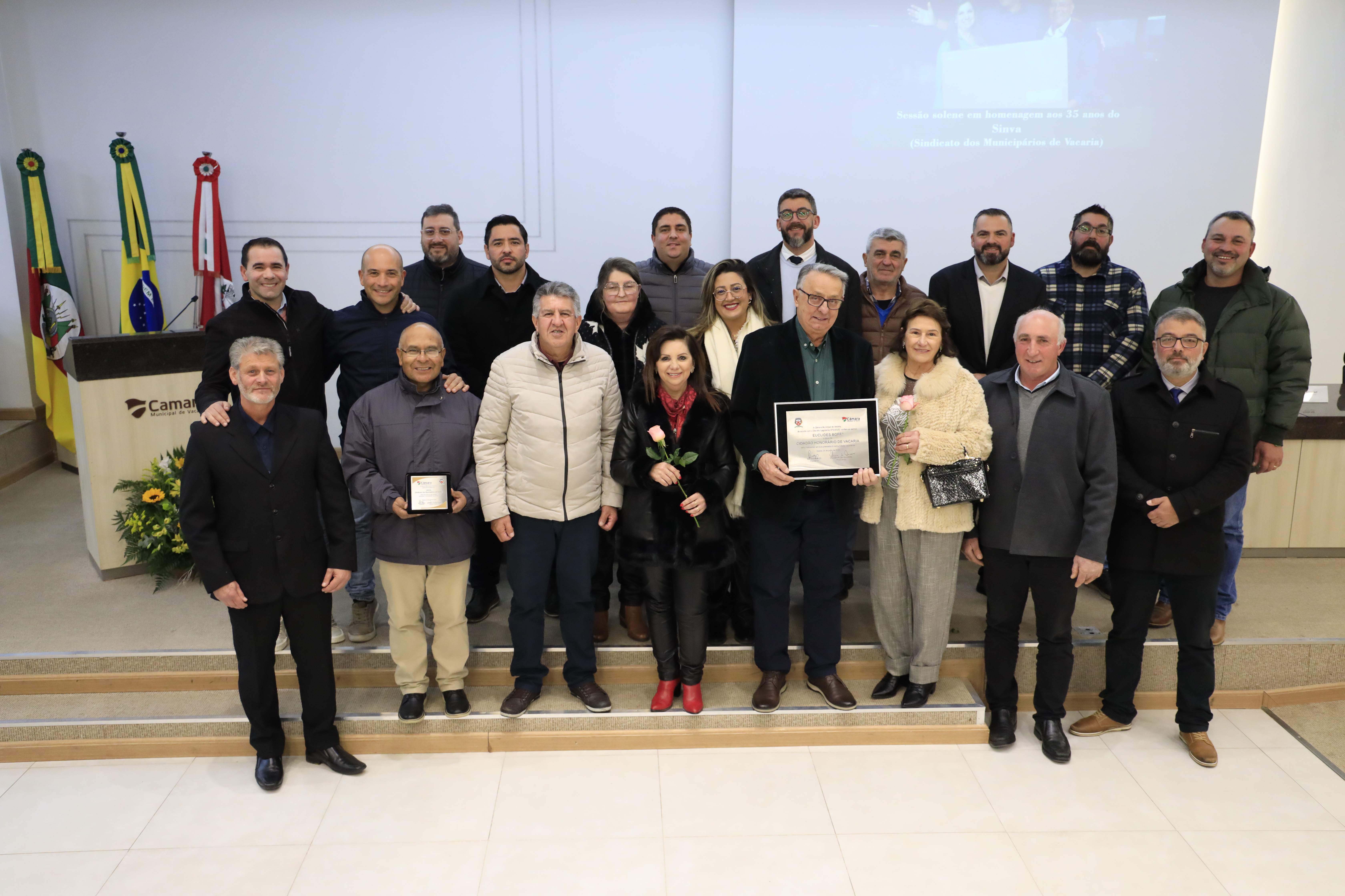 A Câmara de Vereadores de Vacaria realizou, na noite desta terça-feira,24/06, uma sessão solene em homenagem aos 35 anos de fundação do Sindicato dos Municipários de Vacaria (SIMVA). A solenidade, proposta pelo vereador Fernando Cechinato, reuniu autoridades, servidores públicos, ex-presidentes do sindicato e comunidade em geral, num momento de reconhecimento à trajetória da entidade que representa os servidores municipais.