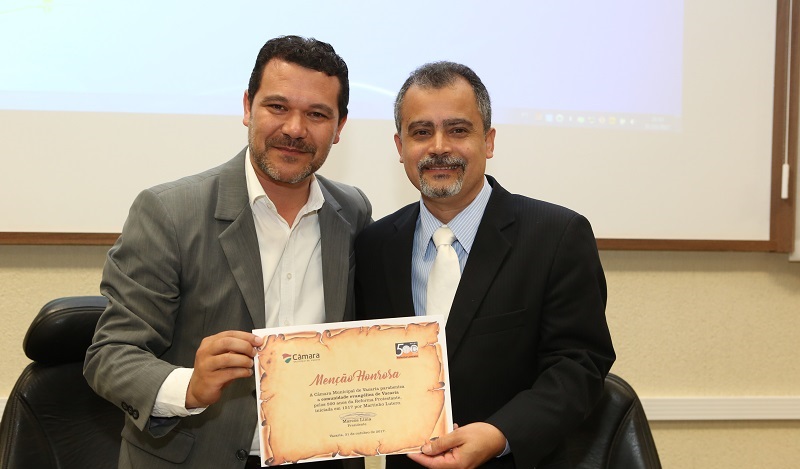 Ao final da solenidade o presidente do Poder Legislativo, vereador Marcos Lima realizou a entrega de uma Menção Honrosa ao Pastor Maciel Costa alusiva a data comemorativa dos 500 anos da Reforma Protestante.