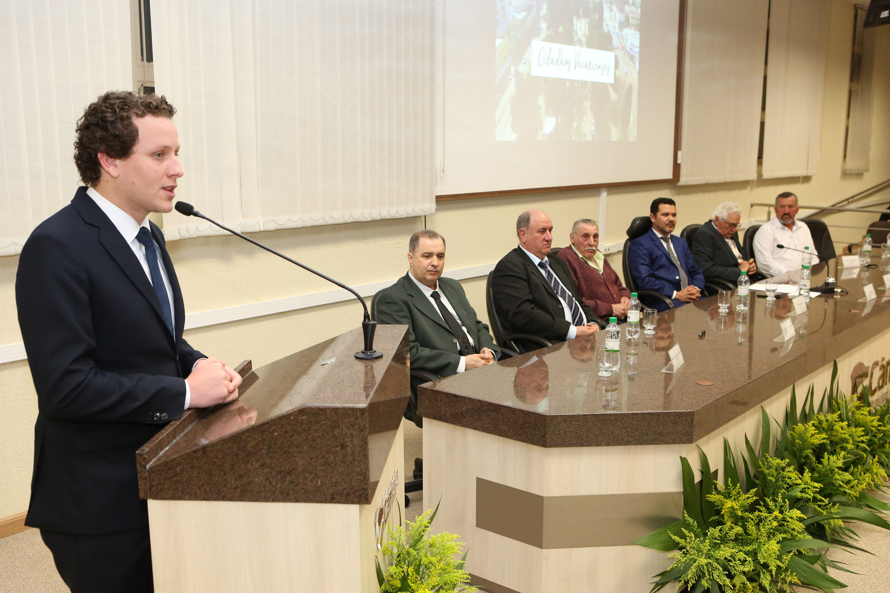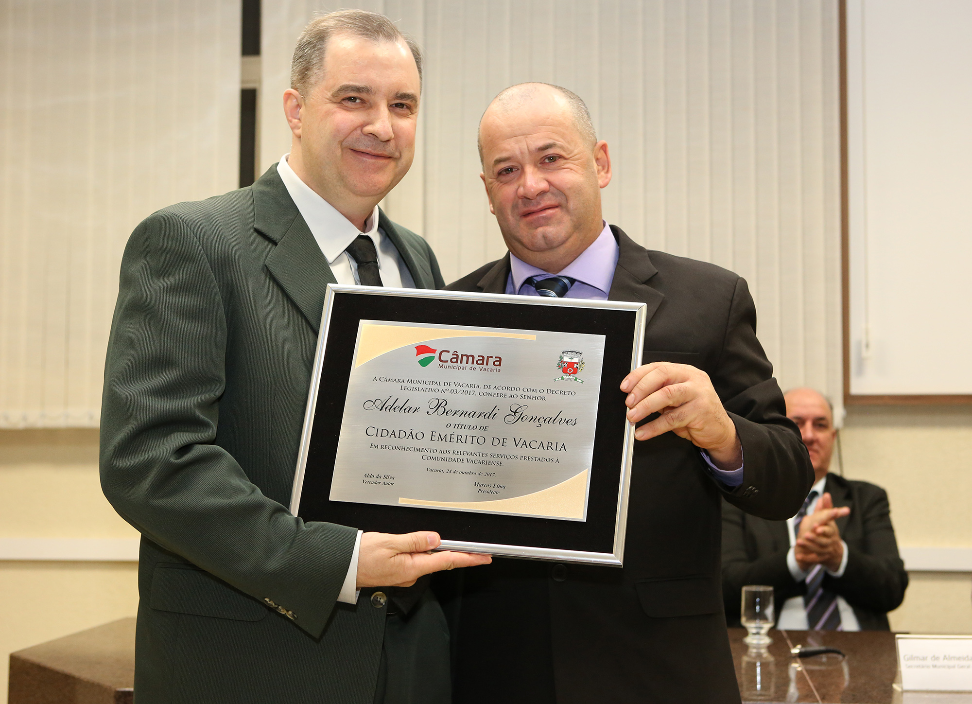 O empresário Adelar Bernardi Gonçalves, sócio proprietário da rede de supermercados Kellermann também recebeu o Título de Cidadão Emérito de Vacaria. A entrega foi feita pelo proponente, vereador Aldo da Silva (PT).