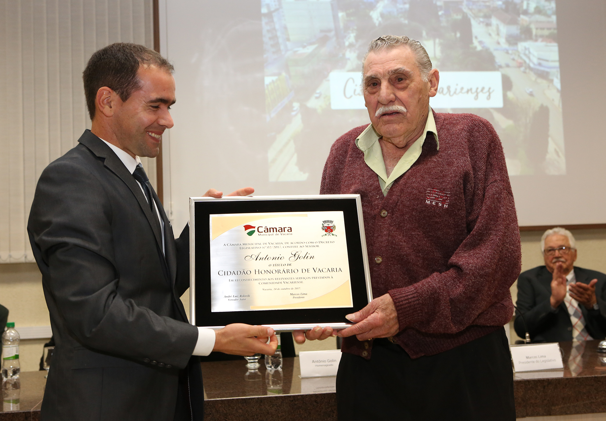 O vereador André Rokoski (PMDB) entregou o título a Antônio Golin, 84 anos, popularmente conhecido como Toni Borracheiro. André fez um breve relato da história de Toni, ressaltando a sua passagem pelo futebol - Toni foi jogador profissional e delegado da Federação Gaúcha e ajudou a contruir o estádio Altos da Glória voluntariamente - seu empreendedorismo em Vacaria – fundou o hotel Altos da Glória e borracharia – e o seu talento como “médico das quebraduras”. O vereador evidenciou, ainda, a atuação humanitária de Antônio. “Toni conquistou o carinho e o respeito da comunidade vacariense por prestar serviço assistencial e humanitário. É conhecido pelas ações de Natal, de dia das crianças e por atender pessoas com quebradurasm ajudando-as e oferecendo remédios caseiros” disse.