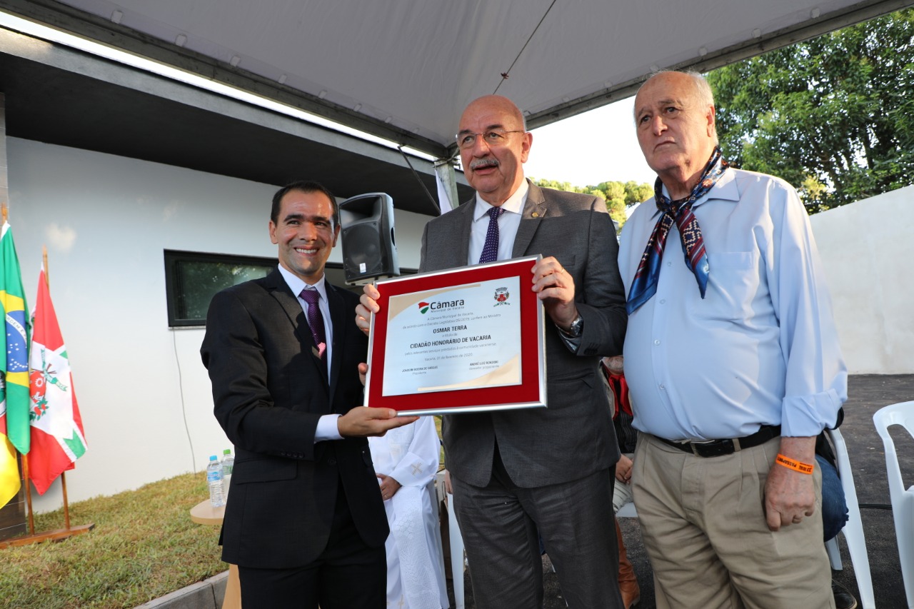 Na oportunidade, o Ministro Osmar Terra recebeu o título de Cidadão Honorário de Vacaria. O Projeto de decreto legislativo 06/2019 teve a autoria do vereador André Luiz Rokoski (MDB) e foi aprovado por unanimidade pelos demais membros do legislativo municipal. Segundo o proponente, a iniciativa foi motivada pela sensibilidade do ministro para com o município de Vacaria, estando sempre atento às demandas que a ele são levadas, em Brasília. Frisou ainda que se trata de um reconhecimento pela atenção recebida do ministro da cidadania, no desenvolvimento de projetos para atendimento às pessoas que mais precisam do poder público.