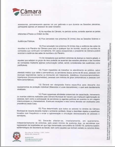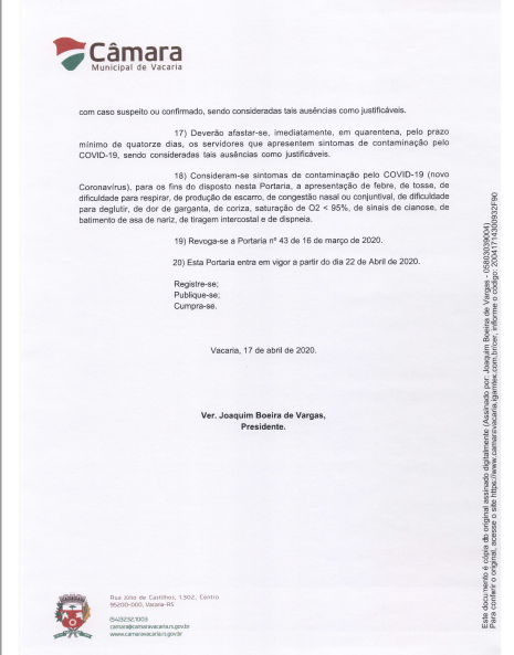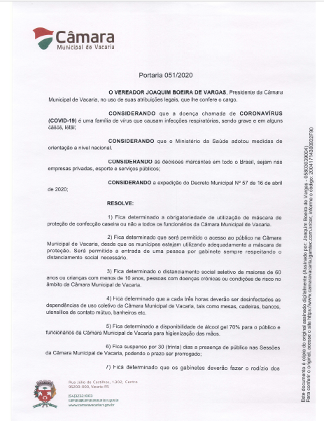 O Presidente da Câmara Municipal de Vacaria, vereador Joaquim Boeira de Vargas, liberou na tarde de sexta-feira (17), a Portaria 51/2020 que reforça ações preventivas e orienta os servidores sobre condutas adotadas para evitar a disseminação do Novo Coronavírus em Vacaria.