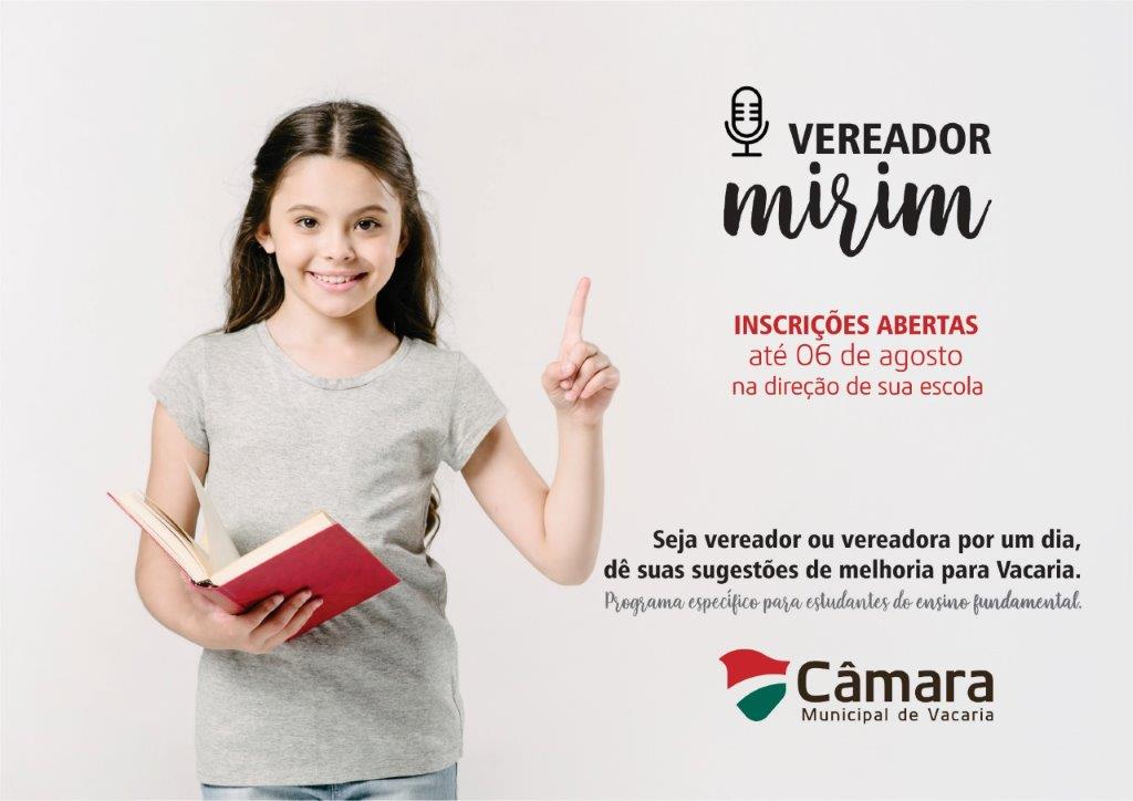 A Câmara Municipal de Vacaria iniciou nesta semana a divulgação, junto às escolas municipais, estaduais e particulares, do Projeto Vereador Mirim por um dia. A equipe de comunicação da Câmara e a assessoria da vereadora Selmari Souza da Silva(PT), idealizadora do projeto, estão visitando às direções das escolas e repassando as orientações sobre as inscrições dos alunos do 5º ao 9º ano. As escolas poderão inscrever seus representantes até o dia 6 de agosto.