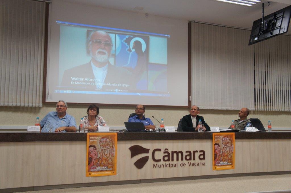 A Câmara de Vereadores realizou nesta terça-feira(23), em seu plenário, uma Sessão Especial sobre a Campanha da Fraternidade 2016, coordenada pelo Presidente Vereador Valdecir Panisson, que contou com a presença do Coordenador de Pastoral da Diocese de Vacaria e Pároco da Igreja Nossa Senhora da Glória, Padre Cláudio Prescendo. A realização do evento foi requerida pelo Ver. Jag Souza do PT e aprovada por todos os Vereadores.