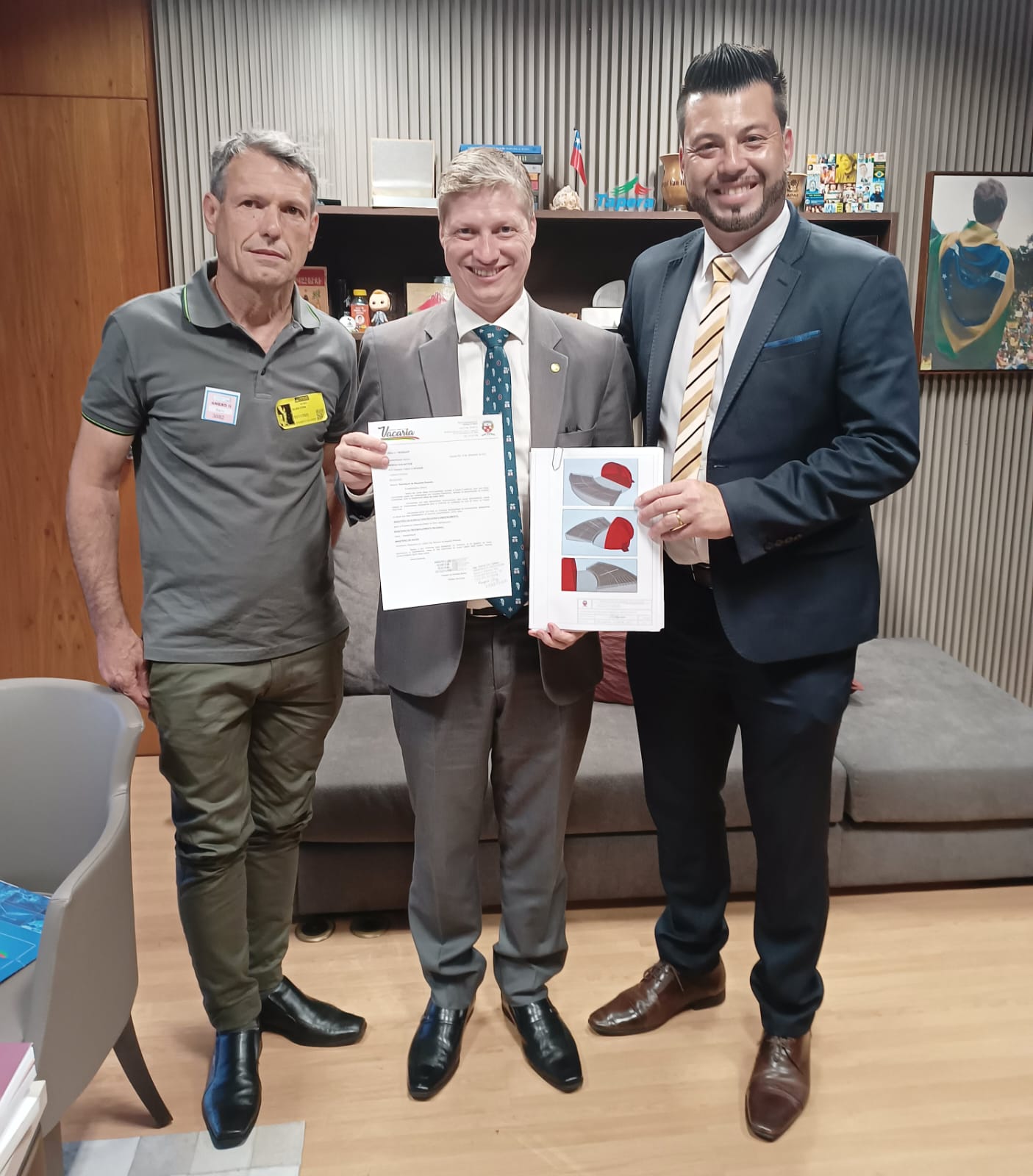 A comitiva junto aos dois senadores gaúchos, Luis Carlos Heinze e Lasier Martins | Crédito: Assessoria Fabiano Vacaria