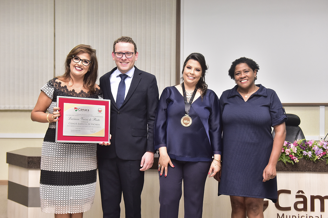 A promotora de justiça Bianca Acioly de Araujo recebeu a Medalha neste ano. Na mesma noite, foi condecorada Cidadã Emérita de Vacaria a empreendedora Luciana Vieira de Brito.
