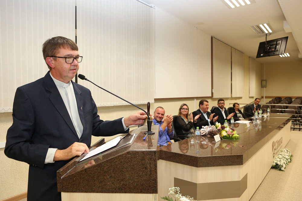 A Câmara Municipal de Vacaria reuniu-se solenemente nesta terça-feira(20), sob a presidência do vereador Mauro Schuler, para prestar homenagem à Comunidade Luterana Voz da Cruz pelos 50 anos de fundação e também para entregar uma Menção Honrosa a uma das fundadoras da comunidade senhora Edwig Wentz Narcizo. A proposição foi apresentada pelo vereador André Rokoski(PMDB) e aprovada por todos os vereadores.