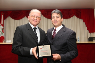 Marcon recebendo a placa das mãos do vereador Chimia | Crédito: