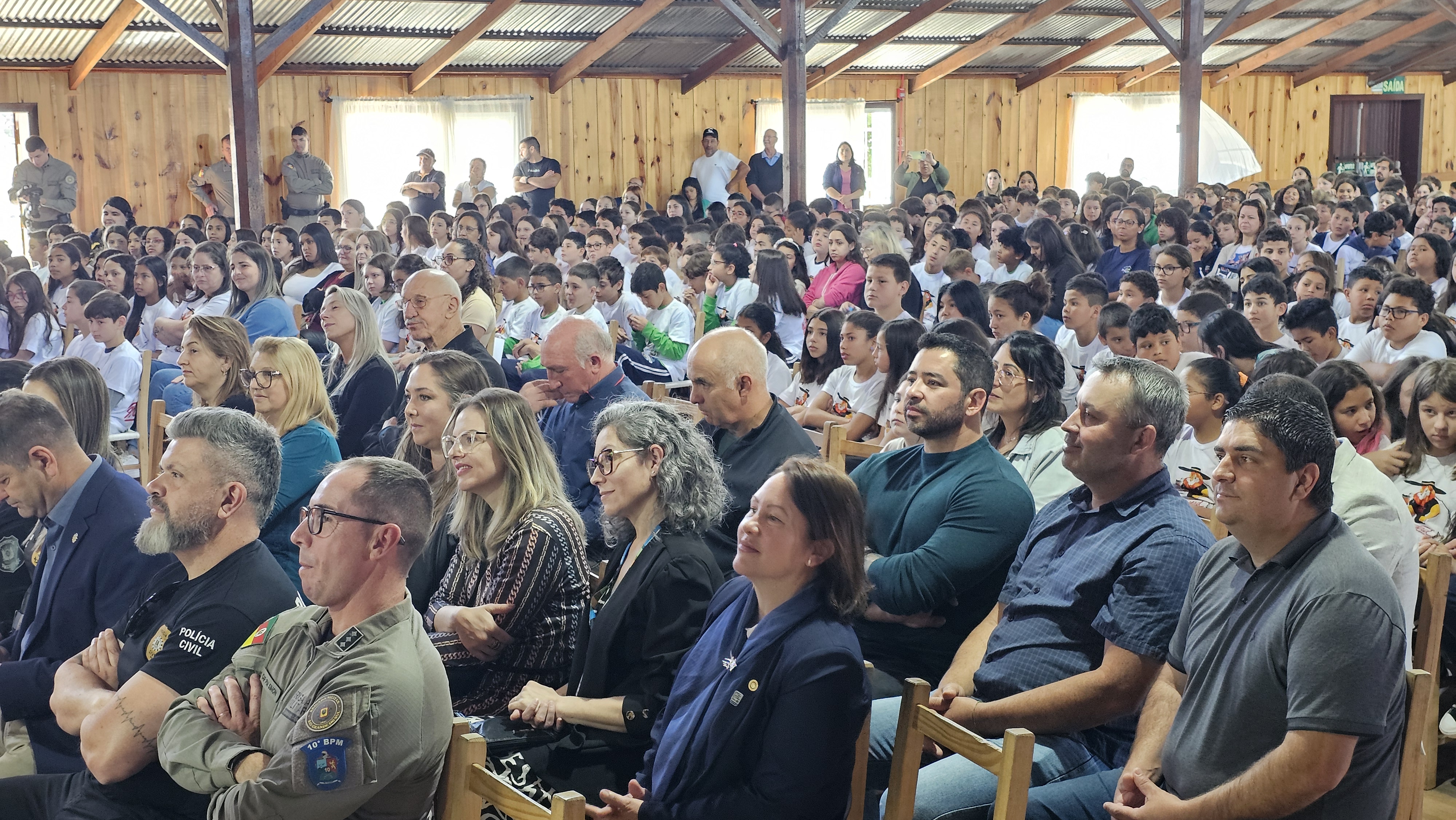 O CTG Porteira do Rio Grande recebeu, na manhã desta terça-feira,25/11, a solenidade de formatura do Programa Educacional de Resistência às Drogas e à Violência (PROERD), reunindo cerca de 650 alunos do 5º ano das escolas de Vacaria. Pais, educadores, autoridades e integrantes da Brigada Militar acompanharam a cerimônia, que marcou o encerramento das atividades do programa em 2025.