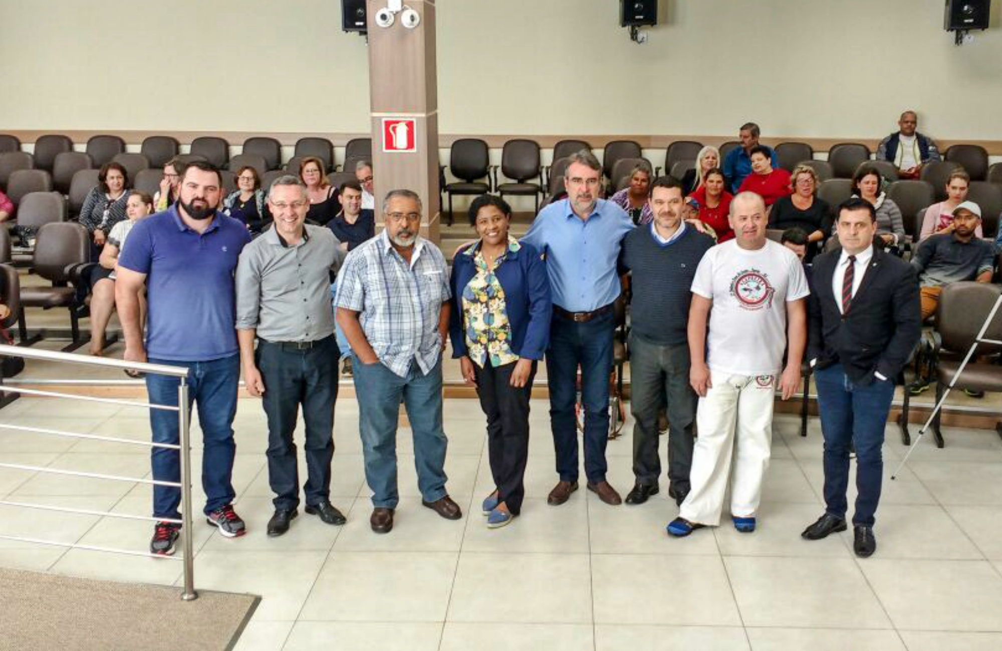 Fizeram parte da mesa de autoridades o Presidente do legislativo, vereador Marcos Lima, a Presidente da Frente Parlamentar, vereadora Selmari Souza, o Senador, Paulo Paim, o Deputado, Henrique Fontana, o Presidente do Conselho Municipal de Drogas, Comissário Abreu e o Assessor Parlamentar do Deputado Henrique Fontana, Elói Poltronieri.