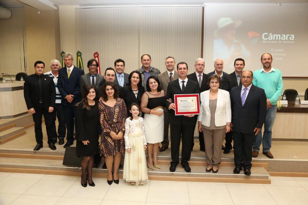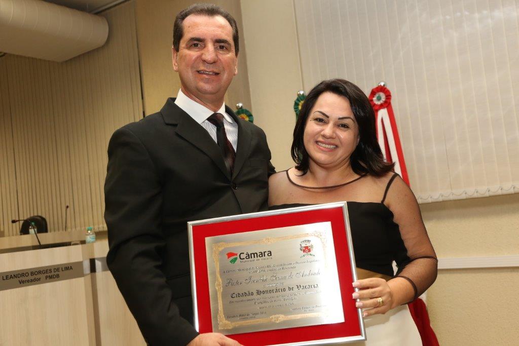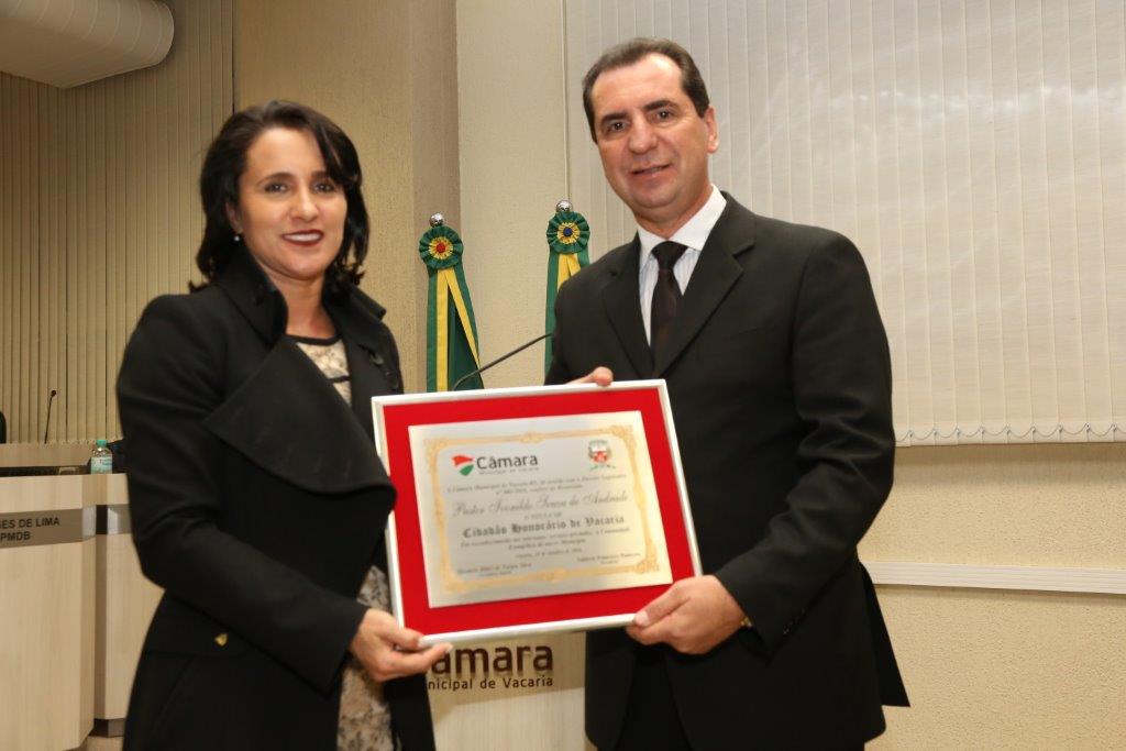 A Câmara Municipal realizou nesta terça-feira (26), sessão solene de entrega do Título de Cidadão Honorário de Vacaria ao Pastor da Igreja Assembleia de Deus Ivonildo de Souza Andrade. A homenagem foi proposta pela Vereadora Elisabete Ritter de Vargas Silva e aprovada por todos os vereadores.