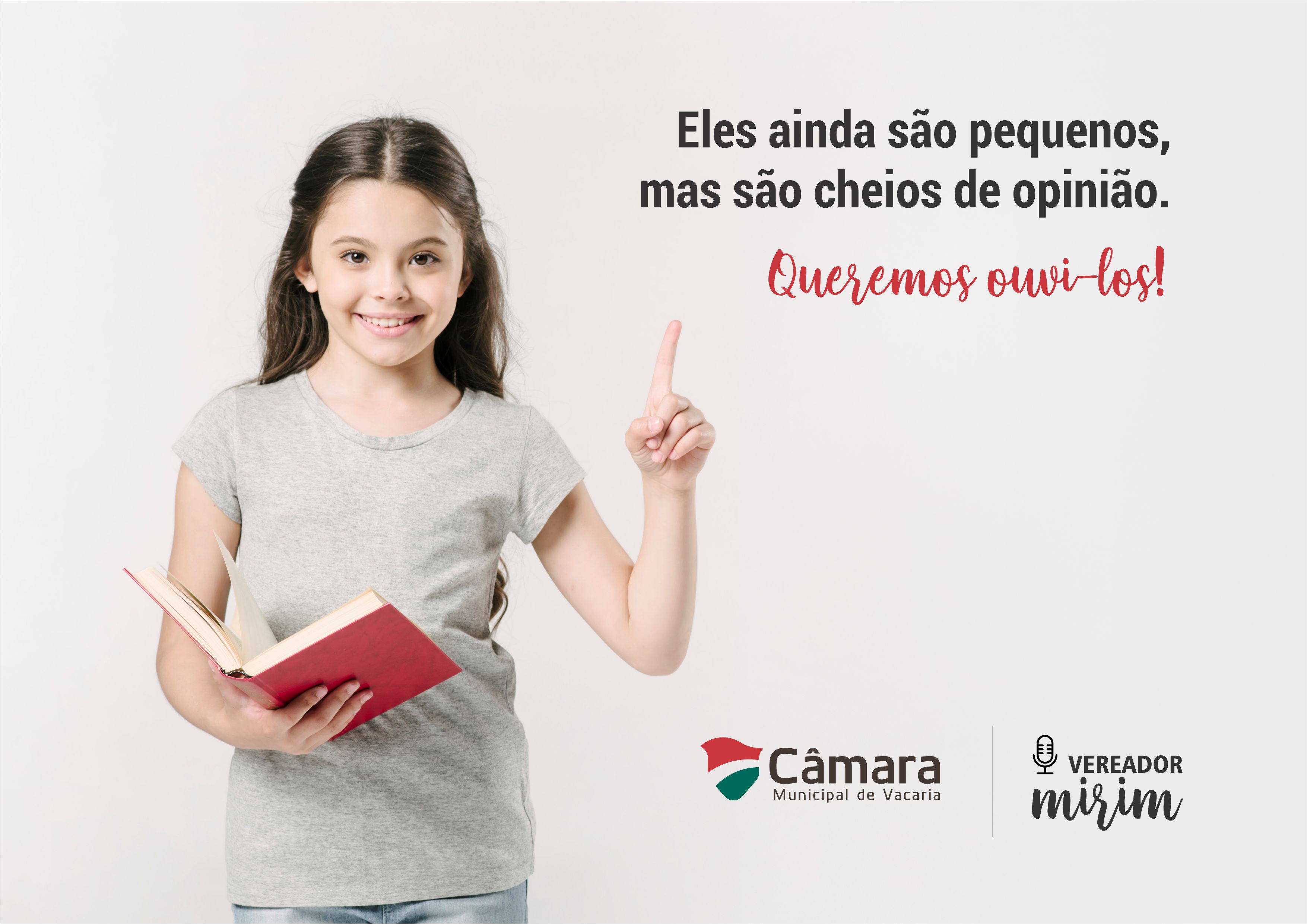 A Câmara Municipal de Vacaria informa às escolas municipais, estaduais e particulares que encontram-se abertas as inscrições para o Projeto Vereador Mirim por um dia que será realizado no dia 27 de agosto, através de uma sessão simulada no plenário da Câmara, às 14 horas.