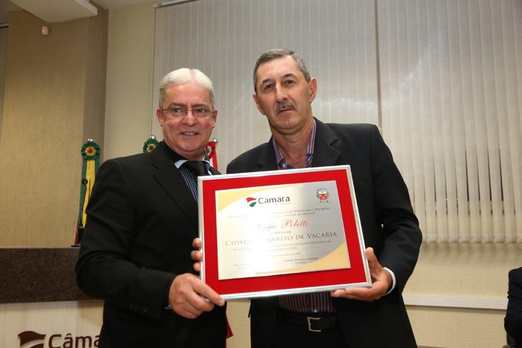 Já o homenageado Sérgio Poletto agradeceu aos Vereadores que aprovaram por unanimidade a proposição apresentada pelo Ver. Osnir Domingues, e afirmou que foi com surpresa que recebeu a notícia da homenagem e agradeceu também a comunidade de Vacaria que o acolheu e reconheceu o trabalho realizado ao longo de sua vida.