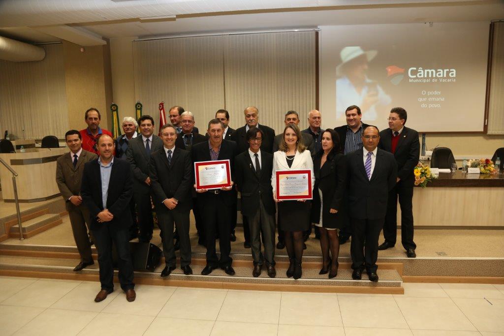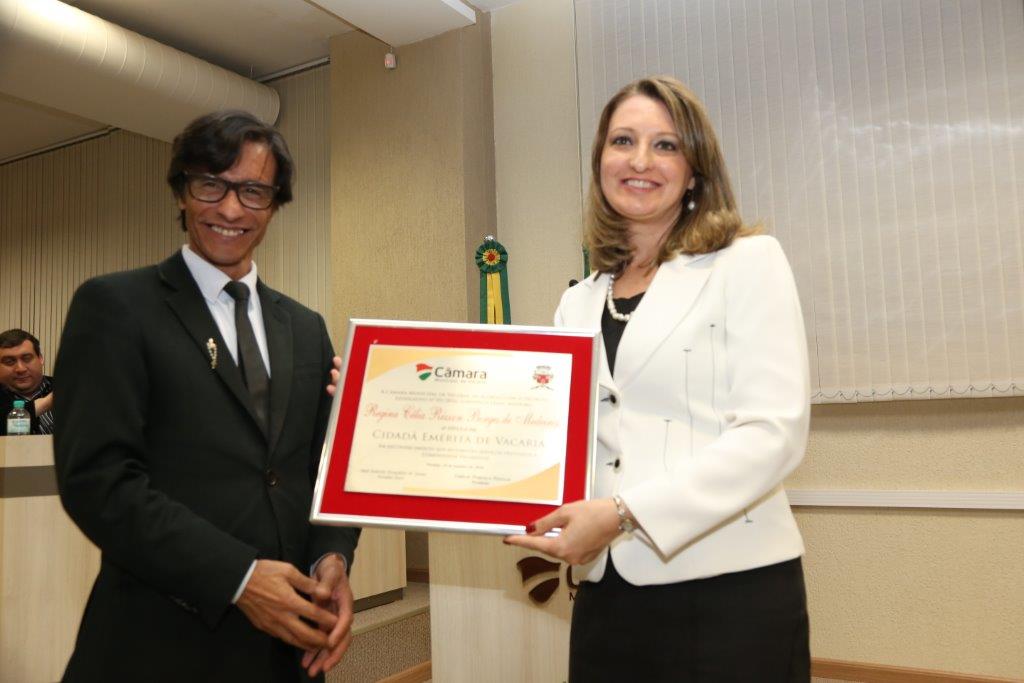 A Câmara Municipal de Vacaria reuniu-se nesta terça-feira (18), solenemente, para prestar homenagem aos 166 anos de emancipação política do município e também para fazer a entrega do título de Cidadão Emérita à Defensora Pública Regina Célia Rizzon Borges de Medeiros, numa proposição do Vereador José Antonio Gonçalves de Souza(PT) e o título de Cidadão Emérito ao Sindicalista e Produtor Rural Sérgio Poletto, numa proposição do Vereador Osnir Domingues (Prós).