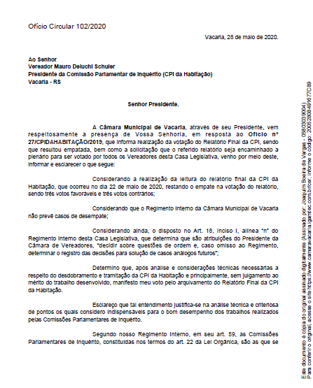 Nesta quinta-feira (28), O Presidente do Legislativo vereador Joaquim Boeira de Vargas através do Ofício circular 102/2020, encaminhado ao Presidente da Comissão Parlamentar de Inquérito - CPI da Habitação, vereador Mauro Deluchi Schuler, decidiu pelo arquivamento do relatório final da CPI.