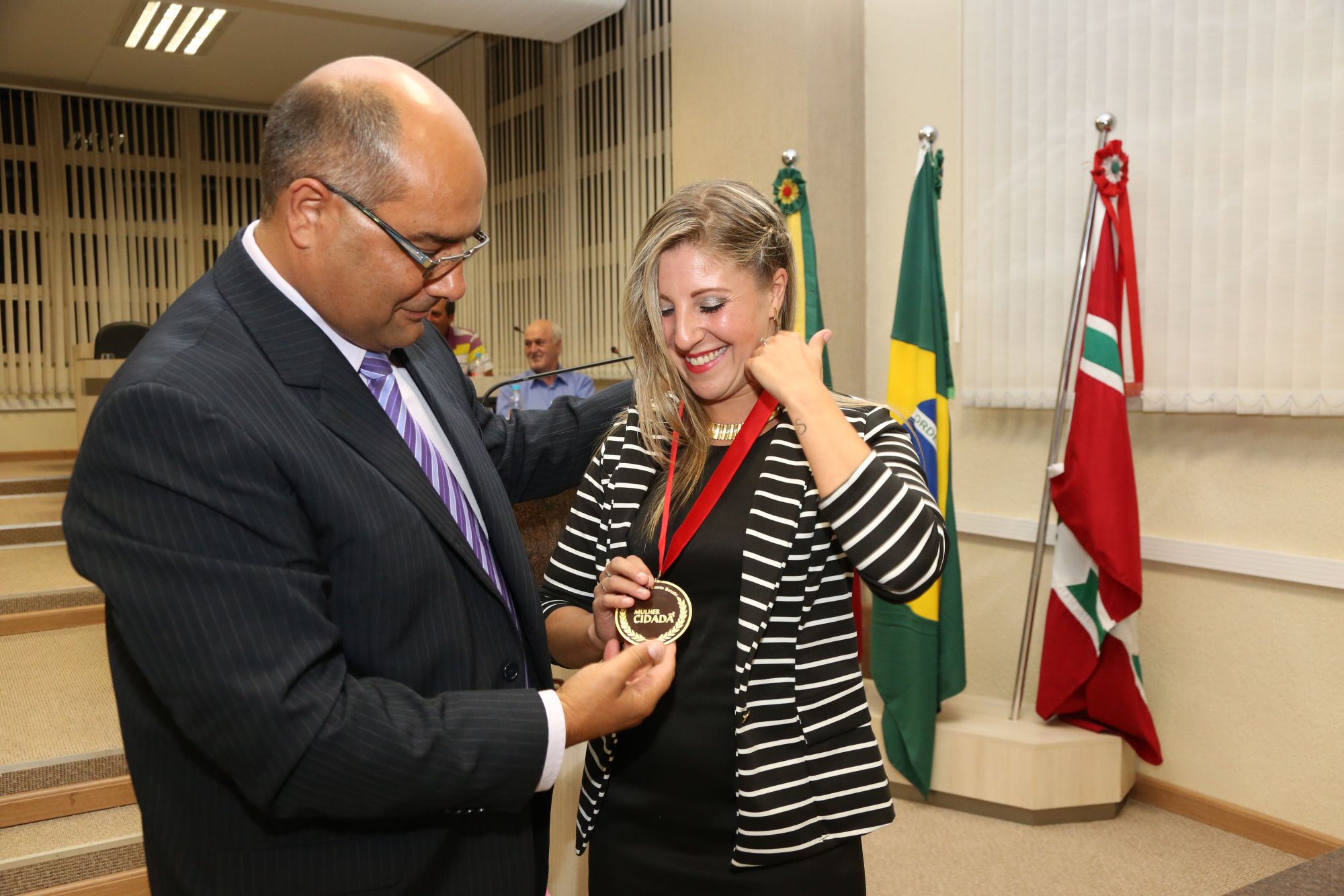 A Câmara Municipal realizou nesta terça-feira (08), Dia Internacional da Mulher, a Sessão Solene de entrega da Medalha Mulher Cidadã à coordenadora dos Grupos de Terceira Idade e Professora de Educação Física Shanna Peixoto Benato. A homenagem foi proposta pelo Ver. Valdecir Panisson do PT e aprovada por todos os Vereadores.