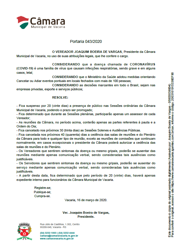 - A partir do dia 17 de março, fica determinado que pelo período de 20 dias, haverá apenas expediente interno para funcionários da Câmara Municipal de Vacaria.