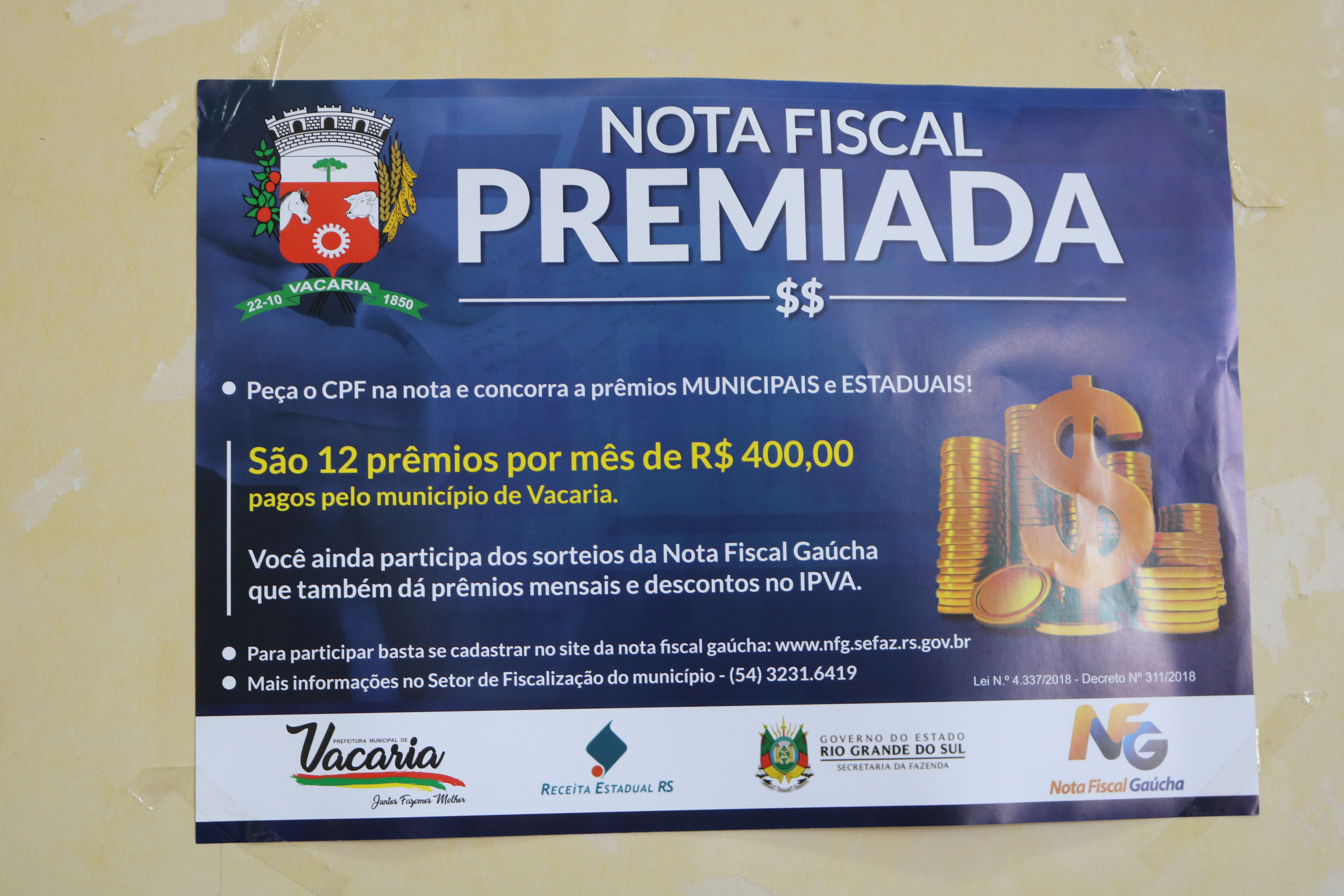 Foi realizado na última sexta-feira (28) o sorteio do Programa Nota Fiscal Premiada, do mês de junho, que contemplou 12 pessoas que compraram no município de Vacaria e pediram a inclusão do CPF no cupom fiscal. Cada ganhador receberá a quantia de R$ 400,00 pagos pela Prefeitura Municipal.