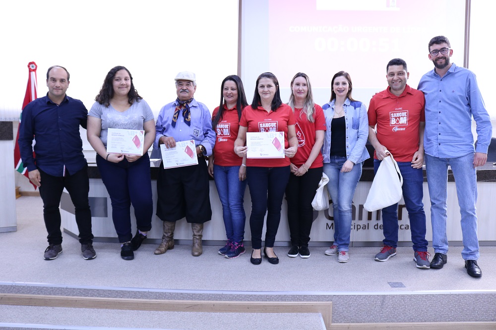 Primeiramente manifestou-se a assistente social do Hospital Nossa Senhora da Oliveira Andressa Castilhos sobre a importância da doação de sangue, fazendo um importante registro em agradecimento a dois doadores efetivos do Clube Sangue Bom. Receberam menções honrosas o doador que mais participou de campanhas de doação de sangue, senhor Adão Pedro de Souza Pinto, que doa sangue desde o ano de 2001 e completou 70 anos, encerrando sua carreira de doador e a doadora mais jovem Nataly Ramos Zanella, que começou a doar no ano de 2017.