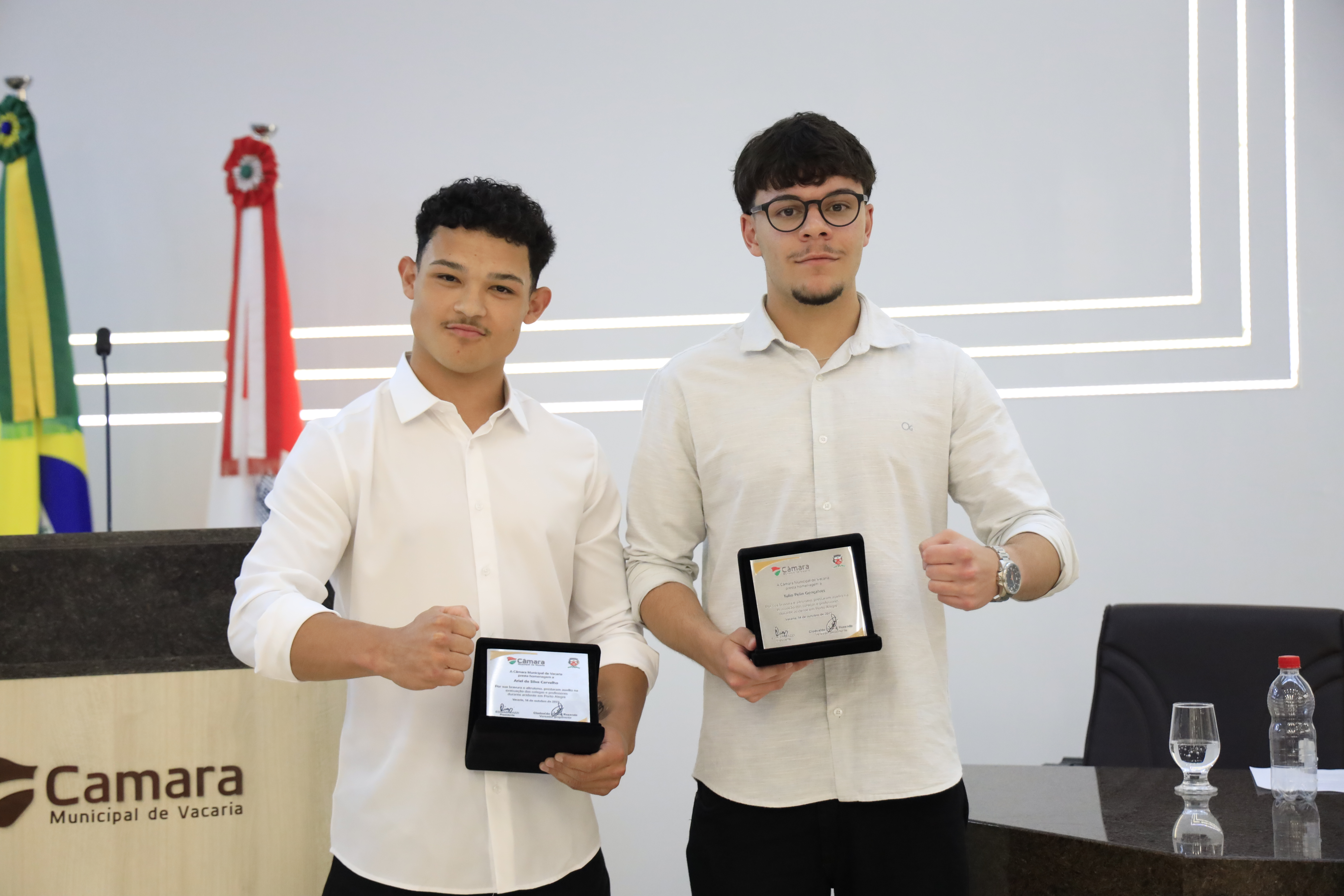 Ariel e Túlio subiram à tribuna para agradecer a homenagem e relembrar o momento vivido em Porto Alegre. “O que aconteceu no dia 3 de outubro ficará para sempre em nossas memórias, não pelo susto, mas pela união. Mantivemos a calma, usamos o que aprendemos e conseguimos ajudar nossos colegas. Agradecemos a Deus, à escola, ao Corpo de Bombeiros e às nossas famílias pelos valores que nos guiam”, expressaram.