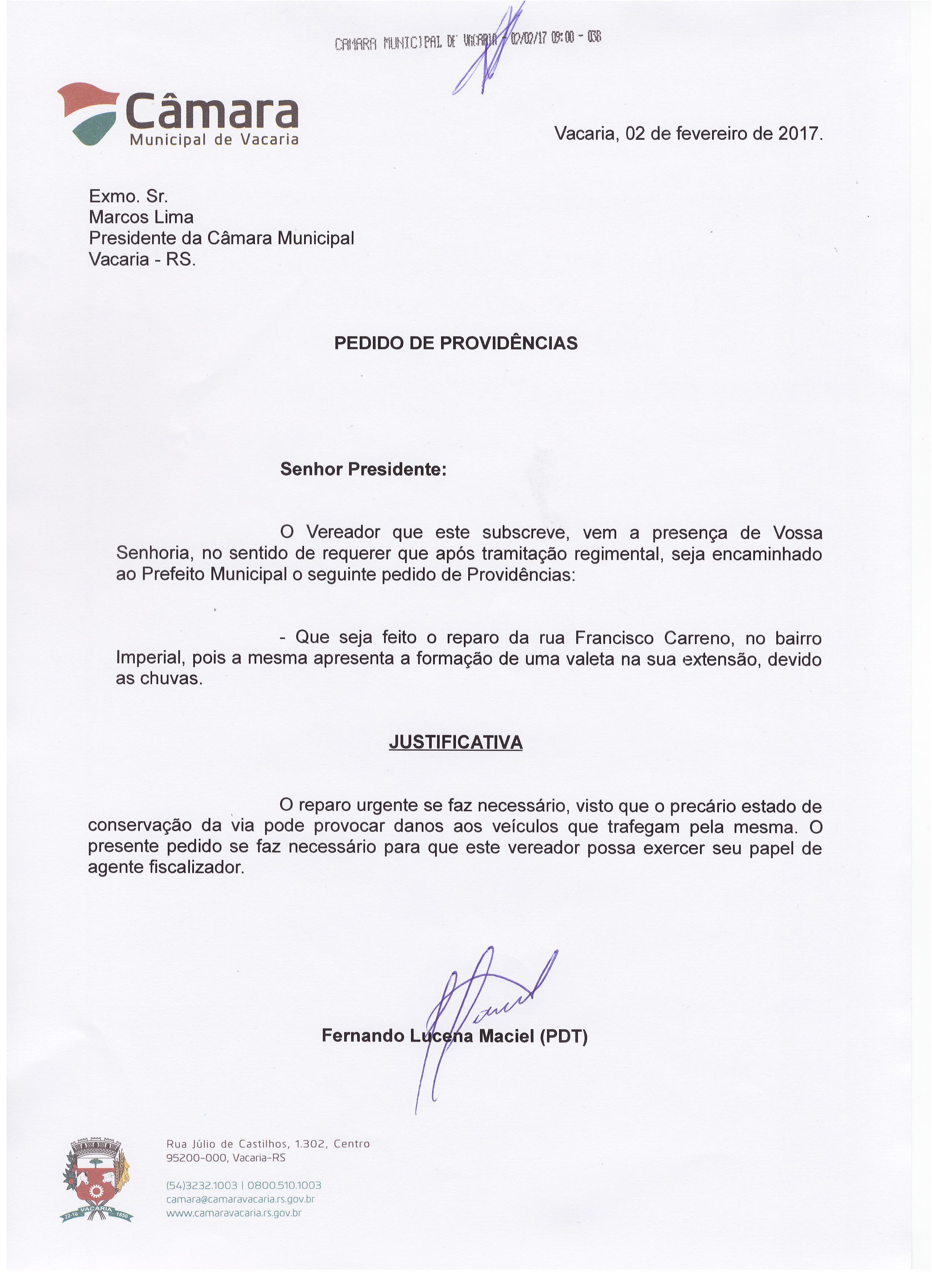 Pedido de providência para que seja feito o reparo da rua Francisco Carreno, no bairro Imperial, pois a mesma apresenta a formação de uma valeta na sua extensão, devido as chuvas.