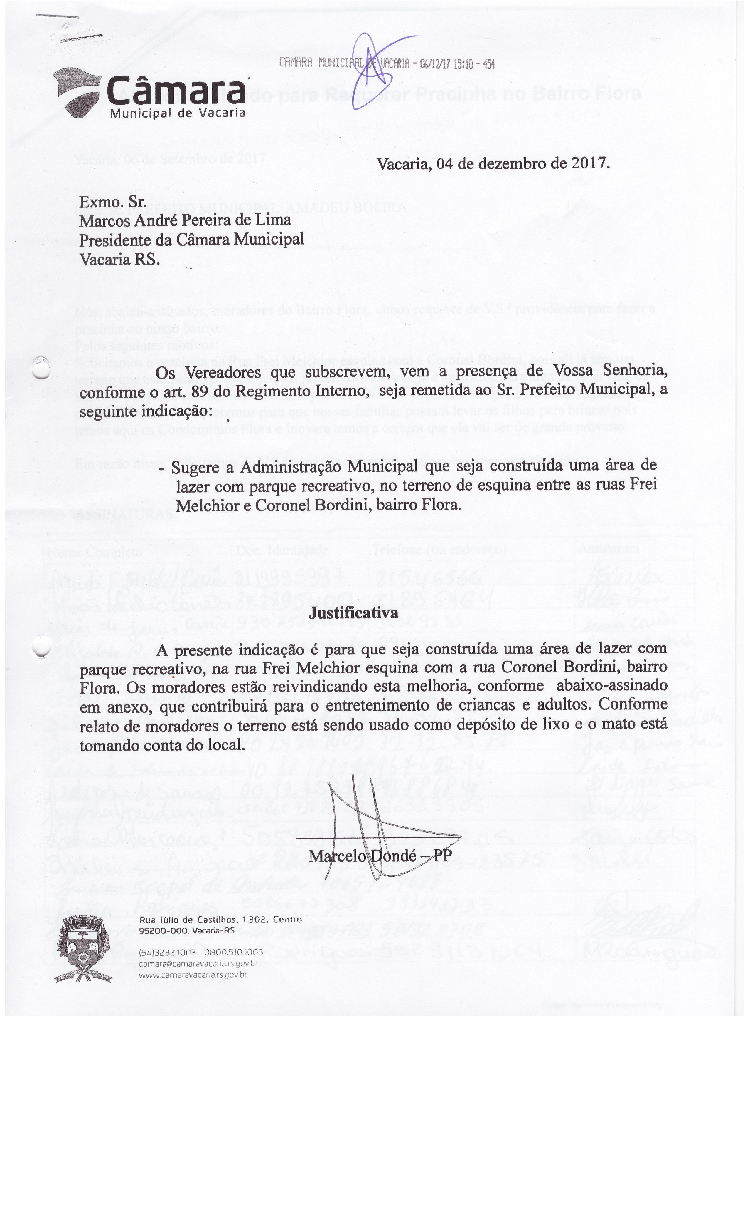 A presente indicação é para que seja construída uma área de lazer com parque recreativo, na rua Frei Melchior esquina com a Coronel Bordini , bairro Flora. Os moradores estão reivindicando esta melhoria ,que contribuirá para o entetenimento de crianças e adultos.